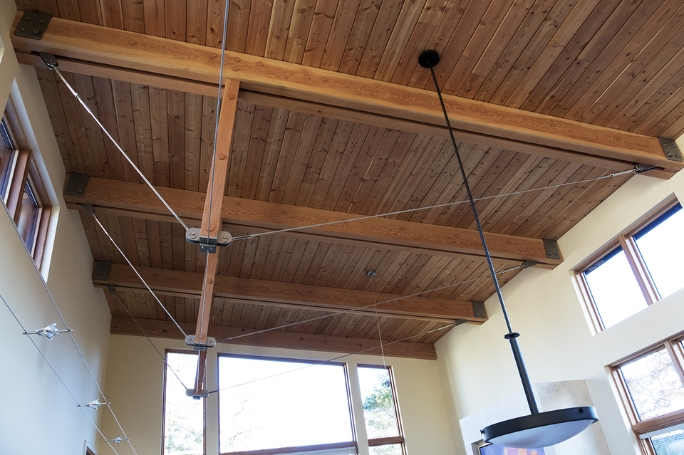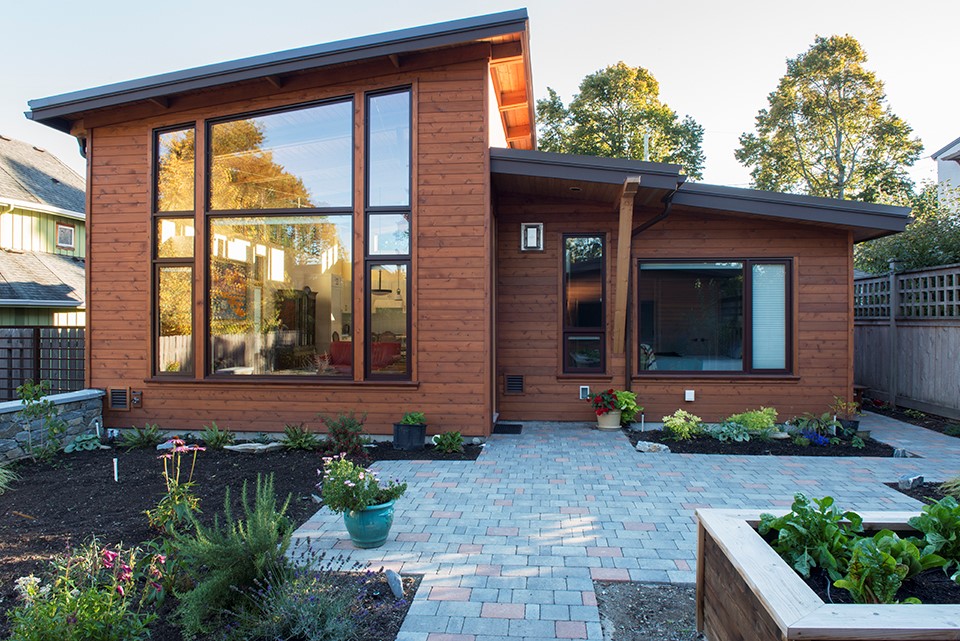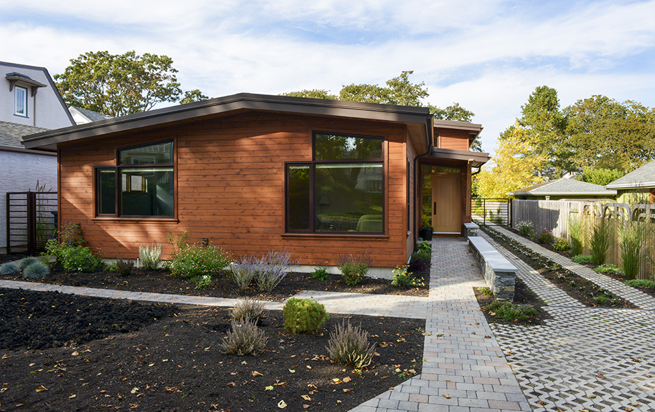 This new custom residence was designed for an active couple with interests in photography and gardening. The one level layout features a great room with kitchen, living and dining overlooking a private rear garden and garry oaks. The westcoast contemporary design features cable-tied douglas fir trusses and ceiling finish, wood windows and cedar siding. Windows are configured to bring natural light movement into the house from sunrise to sunset. A small private courtyard is located along one side providing light and intimate views from the entry hall, photo studio and ensuite bathroom. The low slope roof is expressed as a vaulted ceiling in all the major rooms. A garage in the rear of the narrow mid-block site is accessed via a turfstone driveway planted with clover.