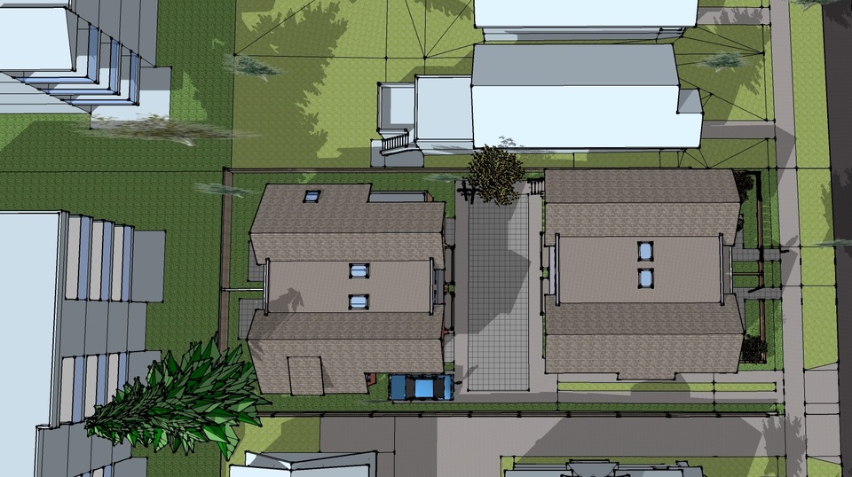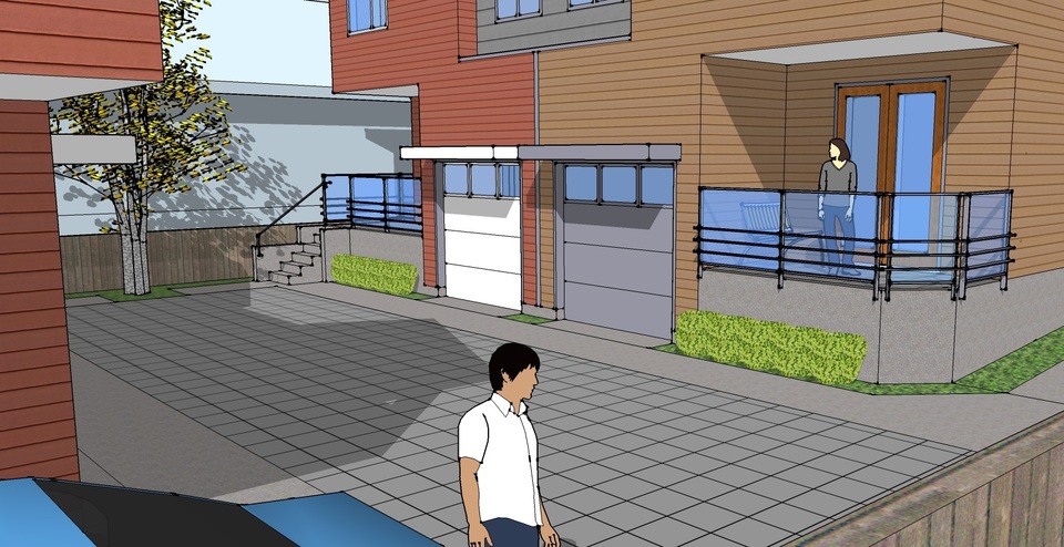 This infill development on a 60' x 135' Victoria residential lot consists of 4 ground oriented family homes gathered around a central pedestrian courtyard with vehicle access. The project is an example of "gentle densification" intended to provide more affordable market housing than what is possible under current single family zoning. The design complements existing traditional houses on the same block thru a variety of roof forms with a contemporary approach to materials, fenestration and detailing. Like urban townhouses, the front yards of both street facing dwellings feature entrance terraces defined by low walls with gates.
